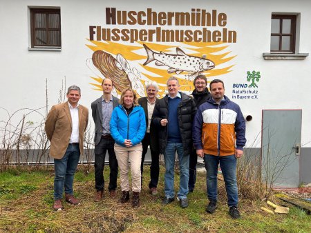 Federal minister Steffi Lemke in front of the Huschermühle. Persons from the left: Ulrich Scharfenberg, Dr. Marco Denic, Steffi Lemke, Richard Mergner, Wolfgang Degelmann, Daniel Höllering und Michal Blaha
