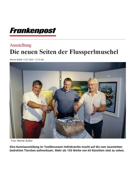 The art exhibition about the freshwater pearl mussel has opened its gates again, this time in the textile museum in Helmbrechts. Since 11th July the diverse exhibits of the approximately 60 artists are to be admired there. The exhibition is open until 31st of July 2023. After that it moves to the Bavarian Forest.